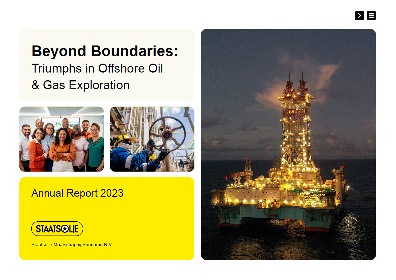 In 2023, Staatsolie reached consolidated gross revenues of US$722 million, compared to US$840 million in 2022. Pre-tax profit in 2023 was US$426 million, compared to US$430 million in 2022. We produced 6.27 million barrels of crude oil. Our refinery produced 3.16 million barrels of diesel and gasoline in 2023, and our subsidiary SPCS generated approximately 1.60 million MWh of electricity, of which 75% came from our hydro-electric plant.