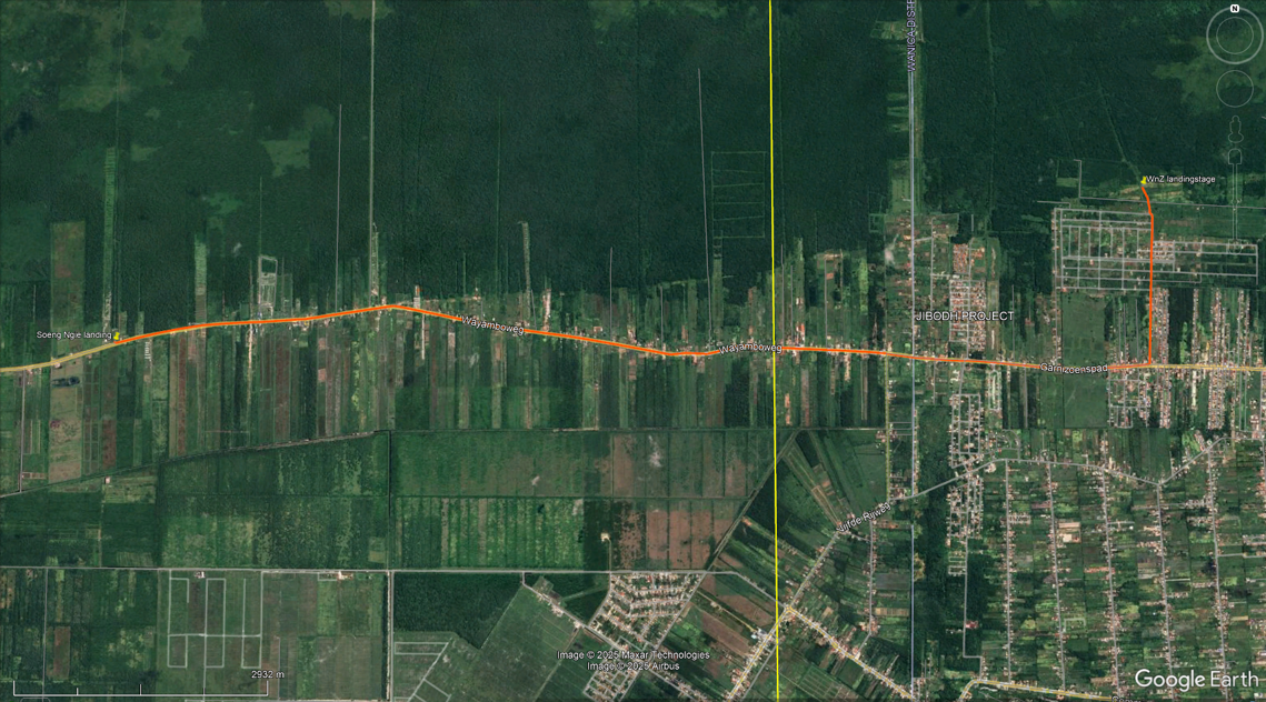 Vanuit de Verlengde Okrodam via de Tuindorp Eurekaweg en het Garnizoenspad (Oostwestverbinding) naar de Wayamboweg perceelnummer 115 in Saramacca.