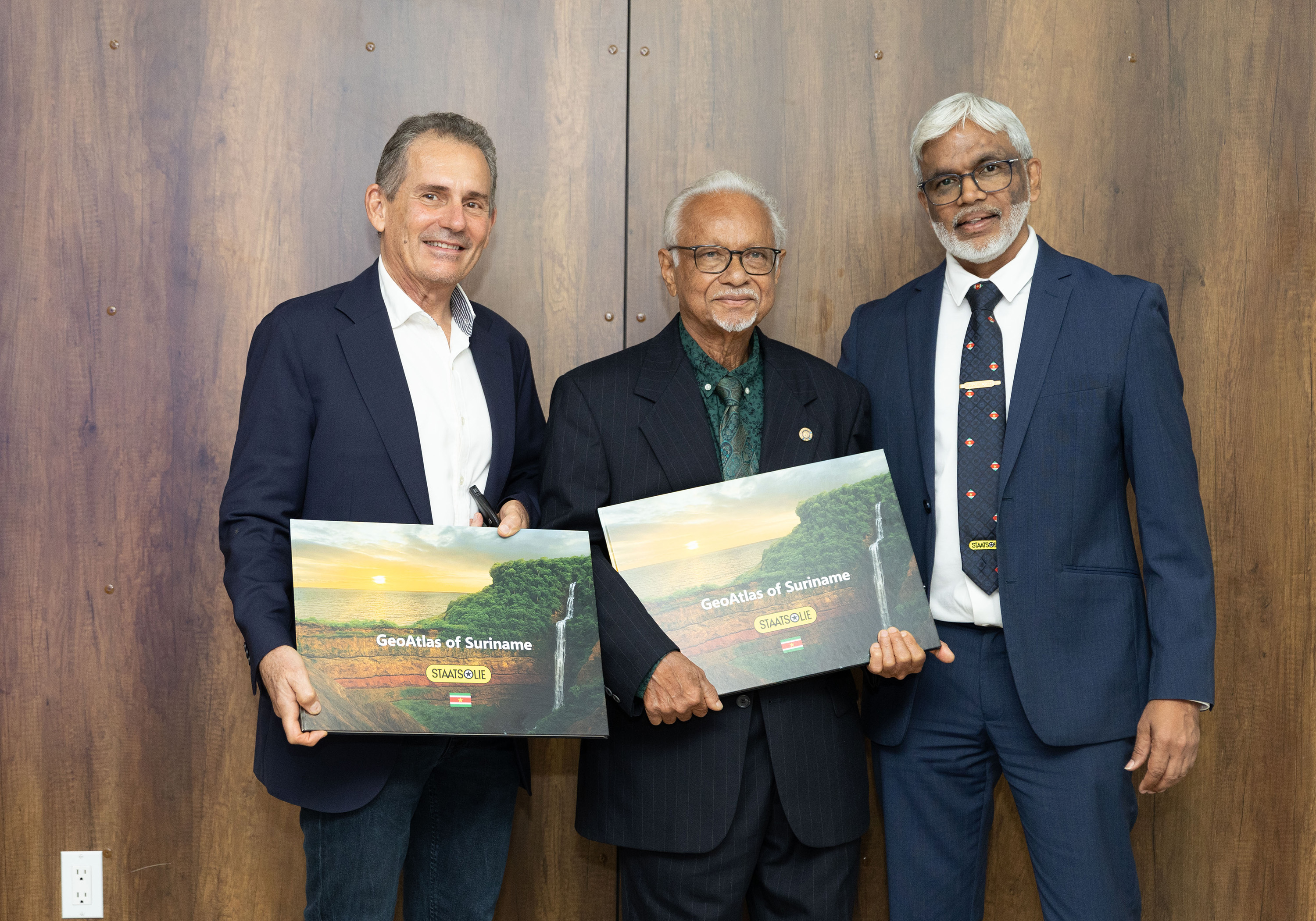 Staatsolie heeft vandaag het eerste gedrukte exemplaar van de GeoAtlas van Suriname gepresenteerd aan de President van Suriname, Jennifer Geerlings-Simons. De president overhandigde vervolgens een exemplaar aan Eddie Jharap, oud-directeur van Staatsolie.