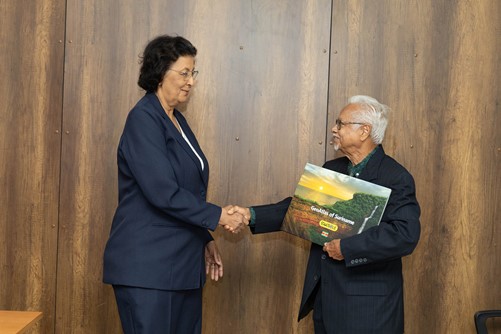 Annand Jagesar (rechts), Algemeen Directeur van Staatsolie, heeft vandaag het eerste gedrukte exemplaar van de GeoAtlas van Suriname gepresenteerd aan de President van Suriname, Jennifer Geerlings-Simons.